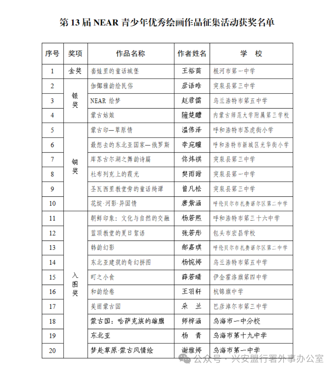 第十三届东北亚地区地方政府联合会(NEAR)青少年绘画作品征集活动,吸引了来自中、日、韩、蒙、俄5国37个地方政府的近千名青少年参与。自治区外事办自2021年起先后组织全区500余名青少年参加NEAR青少年绘画比赛,在国际文化交流舞台上讲述内蒙古故事,为促进我区与东北亚地区的文化交流和友好合作贡献了力量。