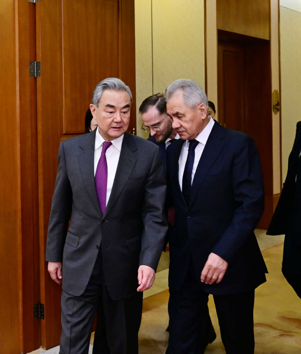 王毅欢迎绍伊古受普京总统委派来华战略沟通,表示当前世界更加变乱交织,二战后国际秩序和国际关系准则受到严重冲击,世界面临倒退回“丛林法则”的现实危险。中俄作为世界大国和联合国安理会常任理事国,有责任有义务践行真正的多边主义,维护以联合国为核心的国际体系,倡导平等有序的世界多极化、普惠包容的经济全球化,推动构建更加公正合理的全球治理体系。